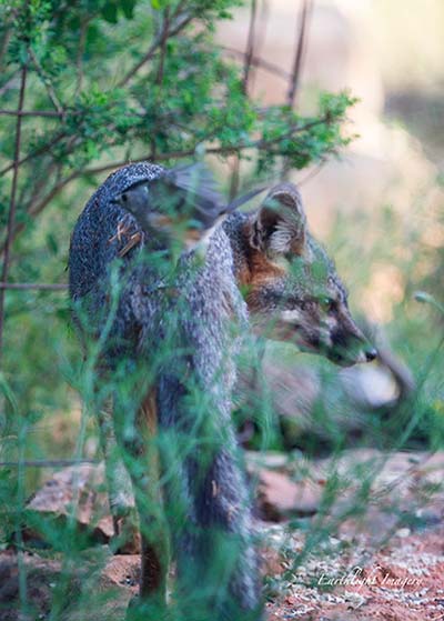 Caretakers note: The new feeding station for the Fox has been moved across the road to avoid conflict with birds and Rock Squirrels. The Rock Squirrels squeek very loudly when Fox is nearby and hurry for cover under the porch.