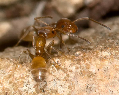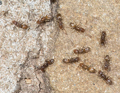 Caretakers note: Caretakers learned through communications with entomologists and with the help of Bug Guide the name of these very small ants.They are common in much of America. They are not fire ants and they are not crazy ants.These tiny ants apparently nest in cracks in the sidewalk. They are noticed because of their movements in and out of tiny cracks. They travel along trails on the pavement into fissures leaving no evidence of the excavation. There is much variation in the coloration of the abdomen. They do not seem to have stingers. It is surprising how much foot traffic and watering they endure. It is good to see a different species of ants than the imported invasive fire ants.