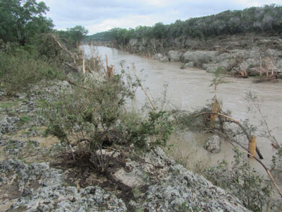 Vulture Gulch after the big flood, the narrow canyon walls caused a loss of most all of the large Cypress, Pecan, Sycamore and other trees. Compare this photo to the Journal entry on May 17, 2015 for perspective.